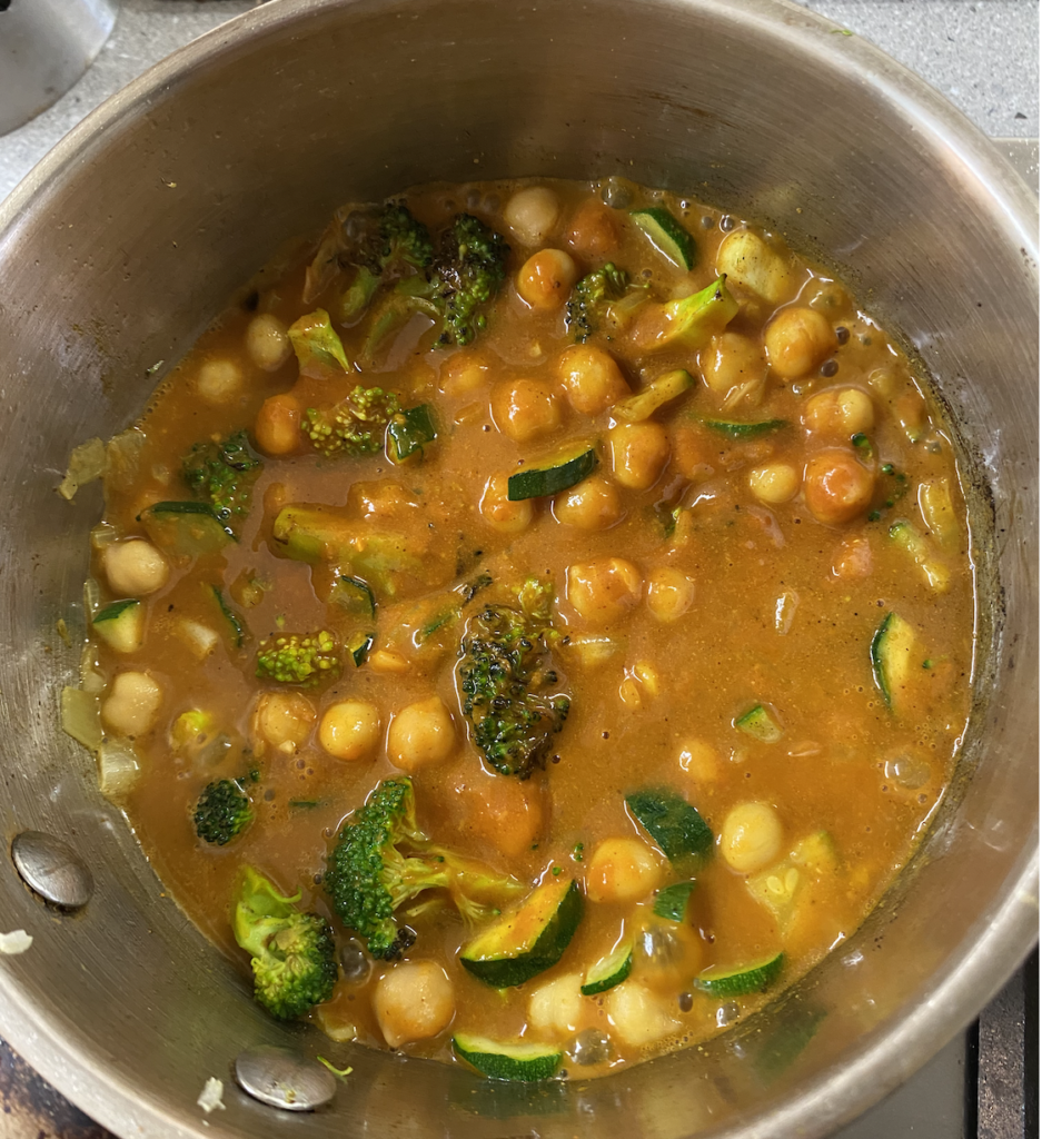 Add the veggies to the other pot with 1/4 of the jar of sauce and 1/2 cup chicken broth (made with the water and bouillon). Basically, you want the veggies to be completely submerged. Add a sprinkle of paprika, curry powder, pepper, and chili powder, and a generous sprinkle of salt. Taste and see what you need more of! Let simmer about 10 minutes. Add the chickpeas. Continue to simmer another 5-10 minutes or until a fork goes into both the broccoli and sweet potato with just a little bit of resistance.