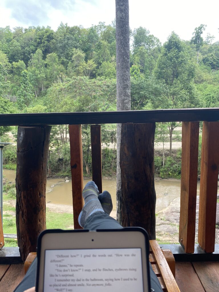 The hum of bugs and the roar of water is interrupted by a bellow from the thick jungled hills. I lower my book onto my lap, raising my gaze from the wild-wood balcony to the green hill beyond. Bugs flit in and out of my vision, but they’re not the only reason I’m in long pants and socks. It’s not cold, but the slight breeze does occasionally lift the baby hair on my arms. It’s cool and comfortable.