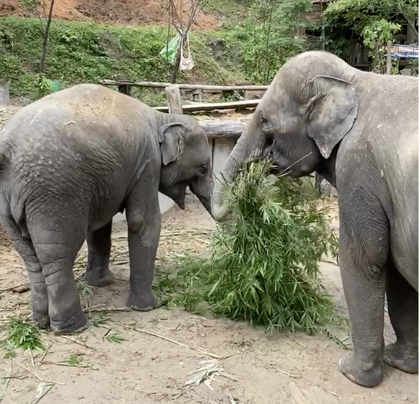 I’m already awake when two elephants lumber up and Chang greets us at our hut with a full basket of sugar cane.