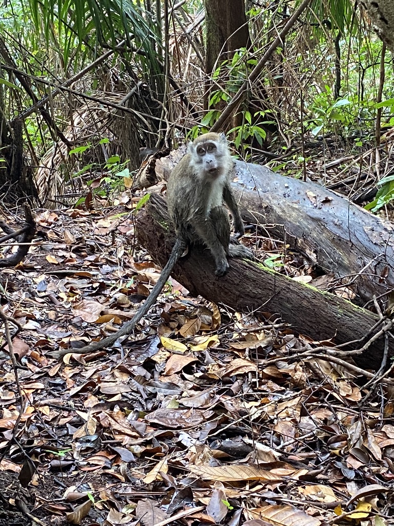 The herpetologist and I take a different path, winding along a trail with a steep drop-off to the forest floor. A long-tailed macaque hangs out by the trail, giving us a curious look. Holding a macaque’s stare or smiling at them is not advised, as it’s perceived as a threat, so we watch without trying to be obvious, which is hard than it sounds.