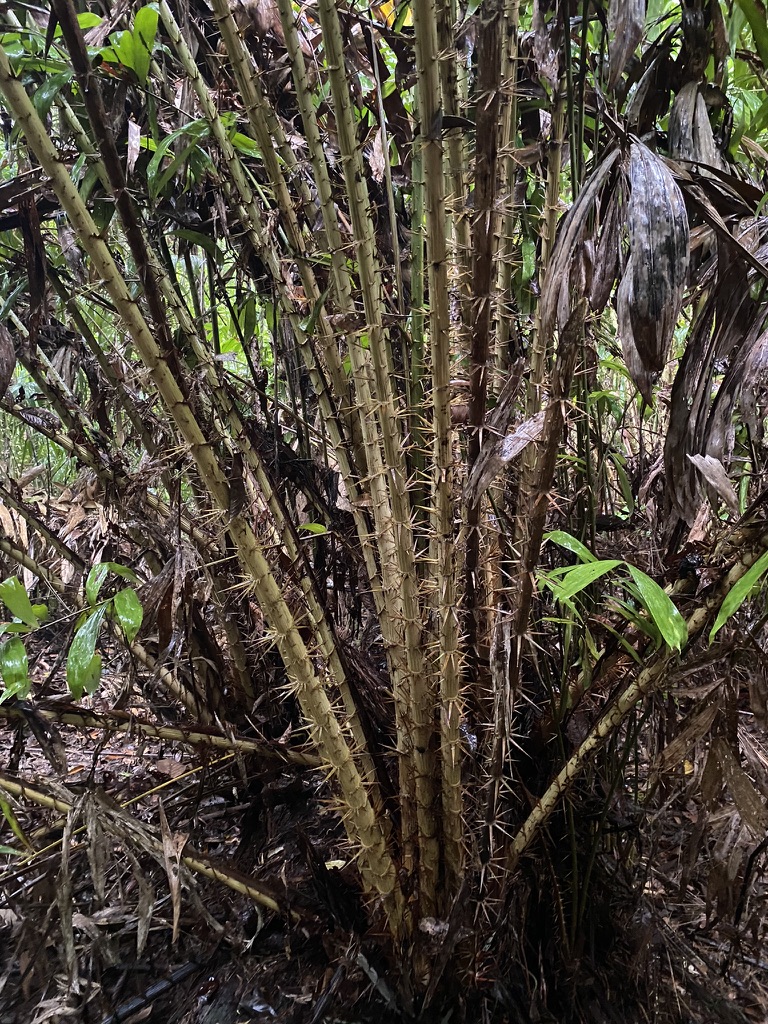 Every way I look, there’s something new to catch my eyes. Plants with razor sharp spikes. A grey monkey–a long-tailed macaque–on a tree high above and almost invisible against the white sky. Masses of greenery, long vines stretching down like traps. Massive leaves that look like a slave should be using them to fan an Egyptian queen.
