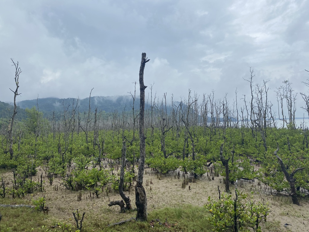 The side trail we take leads us the sea and a mangrove forest. The tide is going out so much of the trees rise out of sand rather than water. This is fantastic for two reasons.