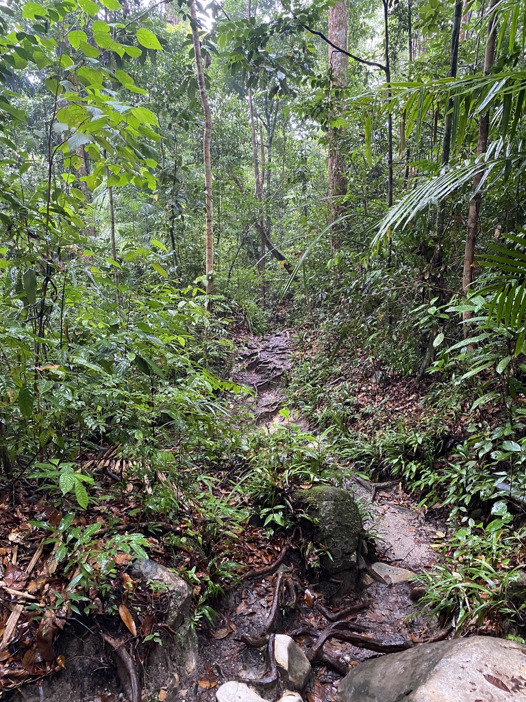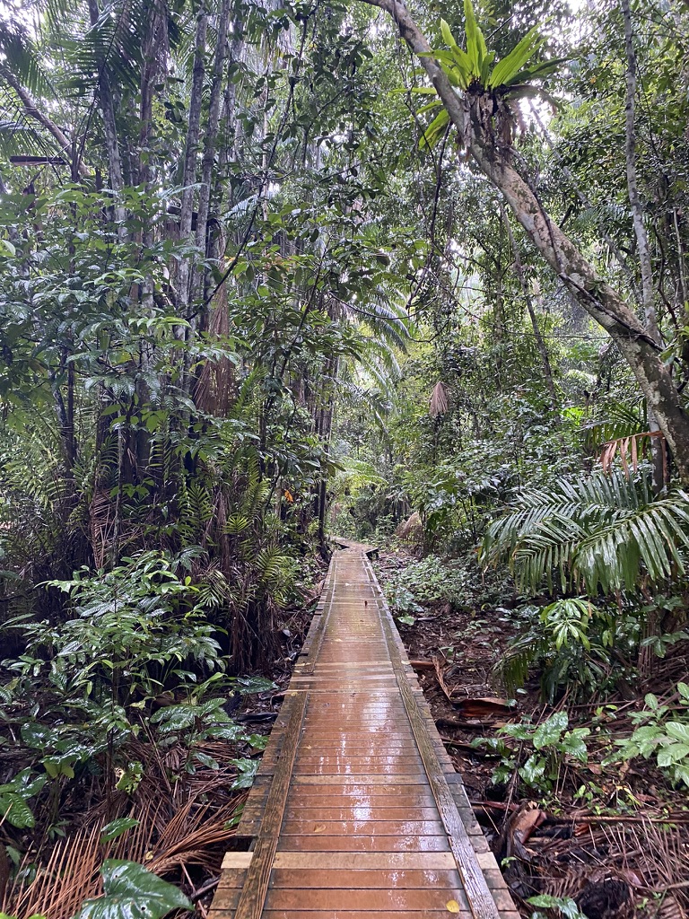 It’s humid and drizzling rain. The board walk stretches into the unknown. We consult the map and set off into the jungle.