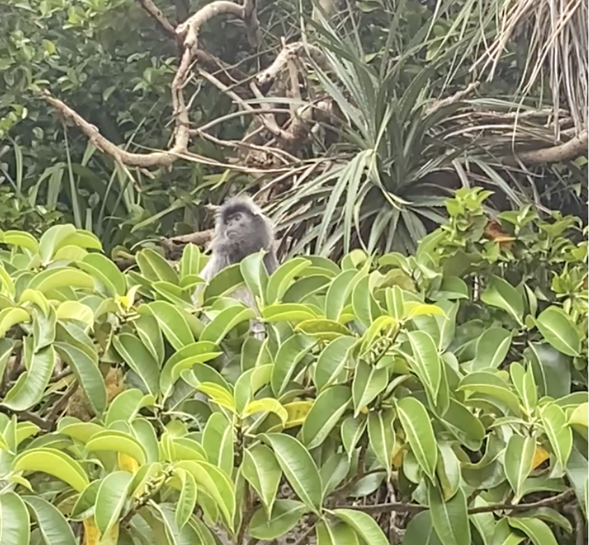 The macaque climbs a tree after a while and we continue on, soon emerging at a beach. For most of the loop walk, I’d only encountered a few other people, but now that we were on a trail close to the park HQ, there are about twenty milling about on the beach. Several of them are gathered around a tree sprouting out of the cliff side. We go over to check it out and find a silverleaf monkey gazing out at us.