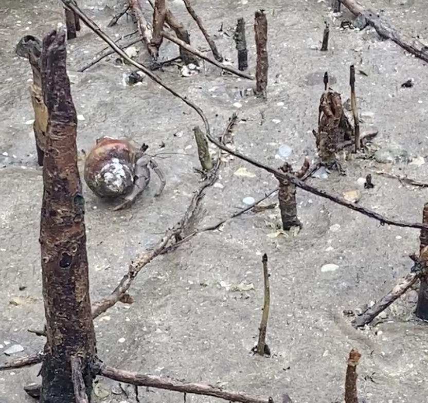 - I get to see my first hermit crab scuttling among the sandy ground.