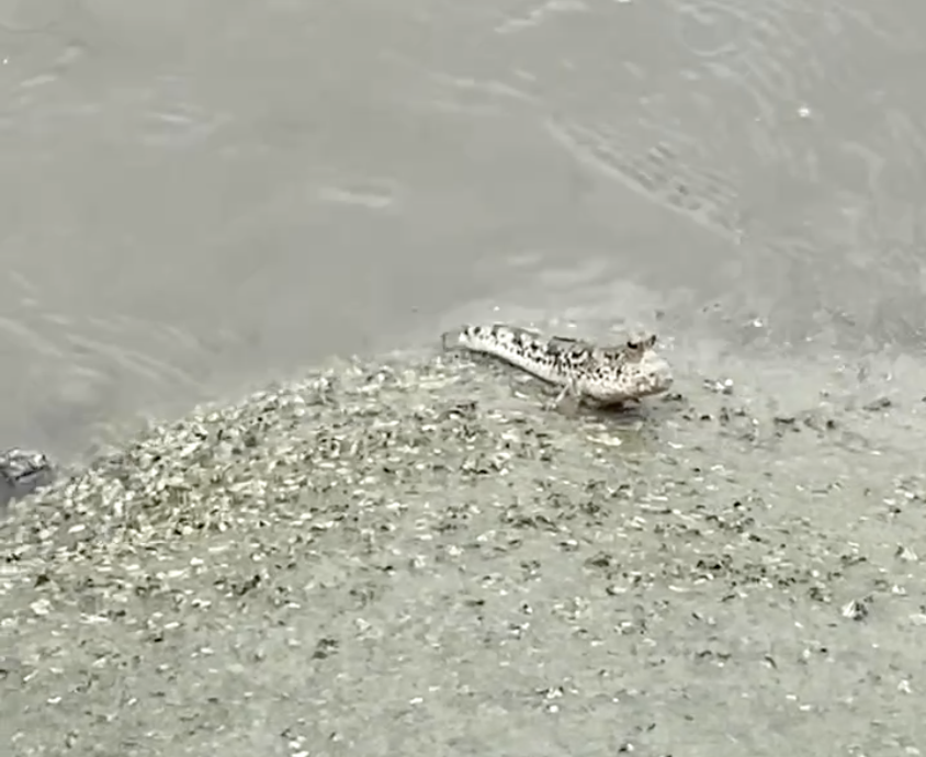 They are tiny, maybe two to three inches in length. They have heads like frogs, two pectoral fins, and a body that tapers into a small point like a slug. They swim with their heads out of the water and jump onto rocks and sand, and then move around with their fins even on dry land. I looked them up just now as I’m writing this and they’re called mudskippers.